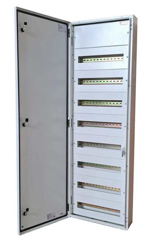 Technické parametry:Barva: bílá (RAL9010)Montáž: na povrch, pomocí přídavného rámu ( viz níže ) je možná i montáž pod omítkuPočet řad v rozvaděči: 8Počet modulů v řadě: 18Počet modulů celkem: 144Typ uzávěru: 3 bodovýMateriál: kovDveře: plnéSvorkovnice: PE/N svorkovniceMechanická odolnost: IK08Hmotnost: 32 kgRozměry: 1400 x 450 x 125 mmStupeň krytí: IP65