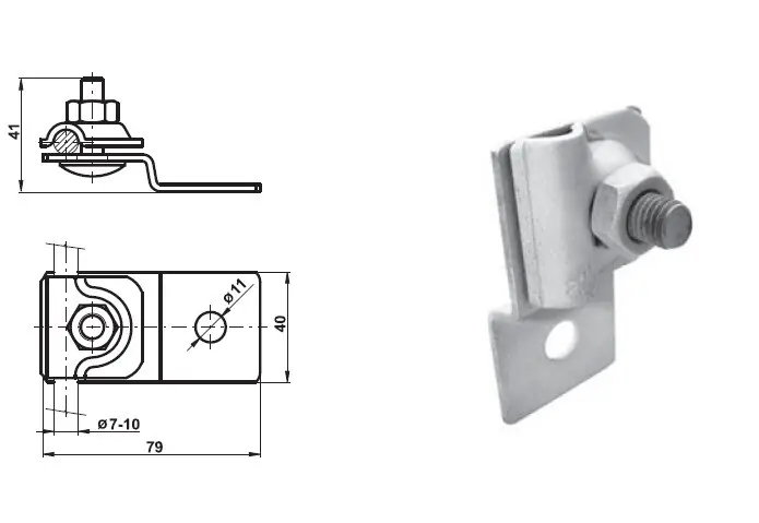 Technické parametry:Použití: svorka je určena k připojování kruhového vodiče ke kovovým částem objektů.Průměr drátu: 7 až 10 mmVýška: 41 mm ( včetně šroubu )Šířka: 40 mmDélka: 79 mmMateriál: nerezHmotnost: 112 g